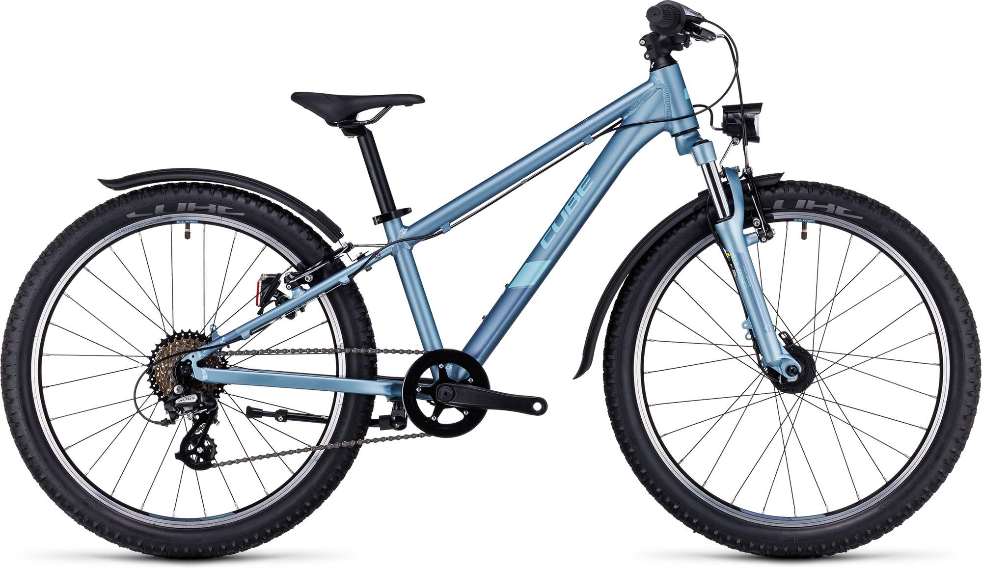 Heb je een kind dat lekker met de fiets naar school gaat, maar op zondagochtend ook graag met papa of mama een leuke mtb-route wil rijden? Denk dan eens aan de CUBE Acid 240 Allroad. Net zo stoer, licht en stevig als een echte mountainbike, maar wel met alles dat nodig voor dagelijks gebruik. Dus niet alleen met de 7 makkelijk schakelende versnellingen en veilige V-brakes met kleinere remgrepen plus een remkrachtbegrenzer op het voorwiel die je ook op de gewone Acid 240 vindt. Maar ook hoogwaardige LED-verlichting, een stevige standaard en spatborden die onderweg naar school de kleding schoon houdt. Die spatborden zijn natuurlijk wel makkelijk afneembaar; dat is in het bos wel zo praktisch. De ideale kinderfiets? Dat zou zo maar kunnen.