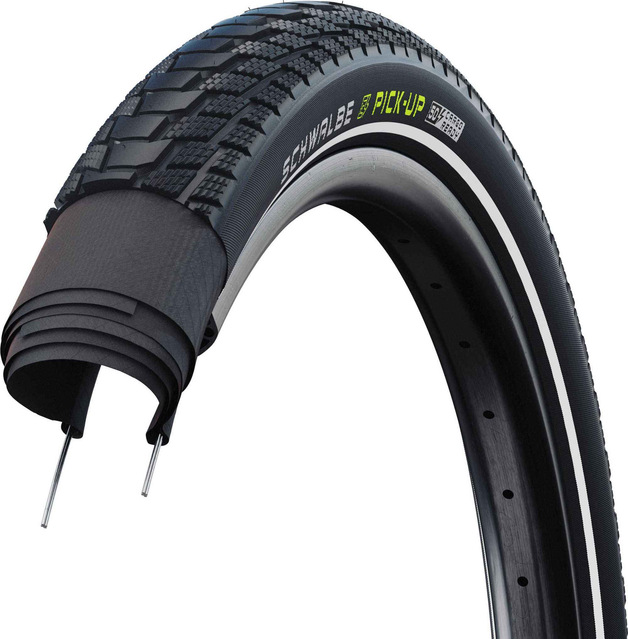 SCHWALBE’S EERSTE ECHTE CARGO BAND. Dankzij zijn extreem stabiele dubbele karkas, wordt de Schwalbe Pick-Up een echte pakezel en biedt tegelijkertijd een uitstekende lekbescherming. Daarbij zorgt het ADDIX E compound voor buitengewoon goede rijprestaties en grip, zelfs in de 20” uitvoering. Met de ECE-R75 certificering is de Schwalbe Pick Up de optimale keuze voor alle e-cargo bikes. SUPER DEFENSE: Het extreem sterke dubbele karkas geeft de band een uitstekende veiligheid onder zware belasting. Meerdere karkaslagen geven de band extra lekbescherming. BELANGRIJK: Om de best mogelijke prestaties bij verschillende belastingen te bereiken, raden wij u aan de bandenspanning van uw fiets dienovereenkomstig aan te passen.